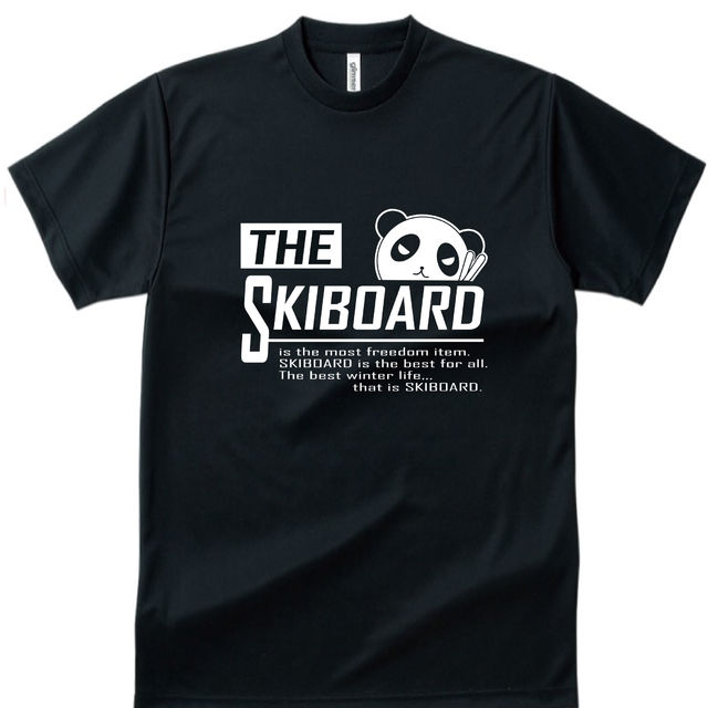 スキーボード・ファンスキーオリジナルTシャツ(黒)のご紹介です。メッシュ素材なのでウェアのインナーやオフシーズンのアウター、タウンユースでもご利用いただけます。前後の二面印刷で、前面はスキーボードのロゴ、背面は裾付近にパンダが印刷されています。